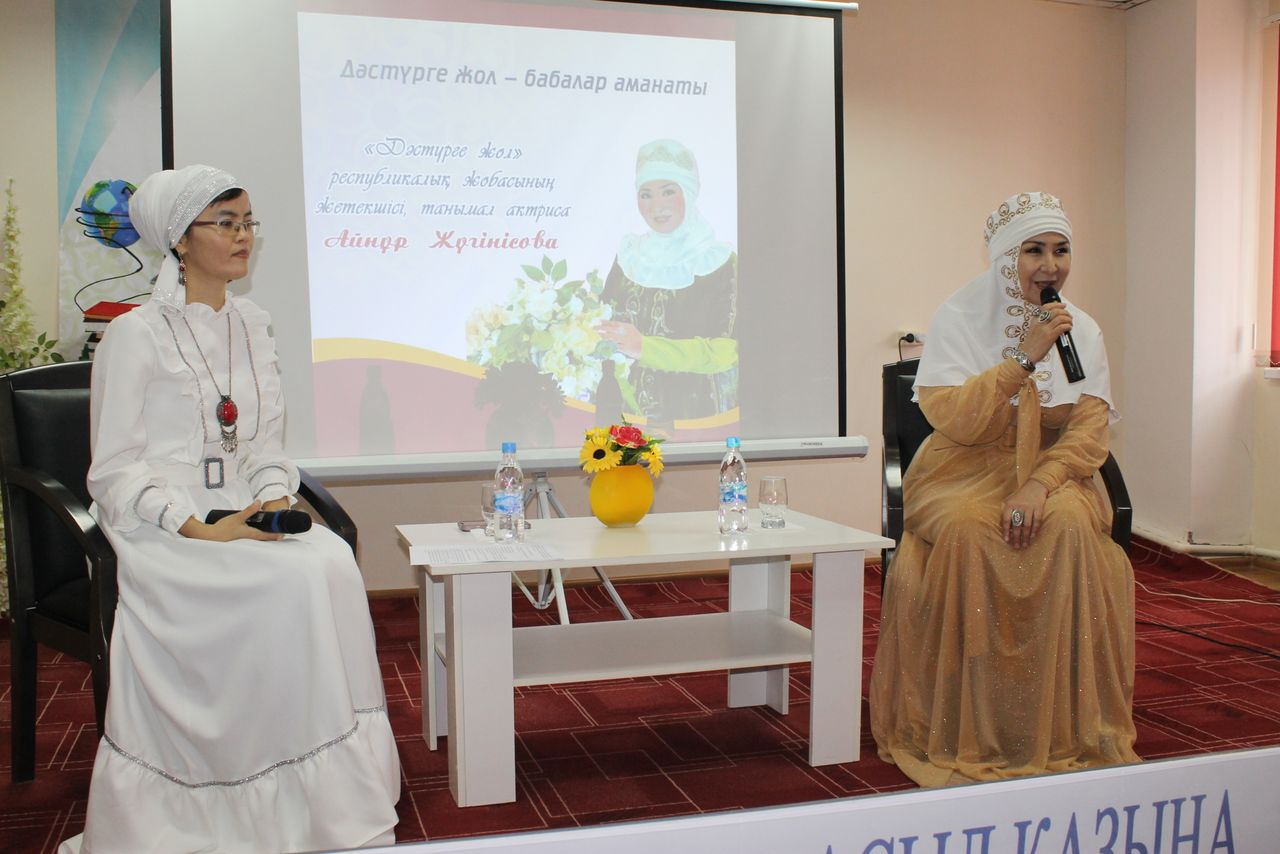 Кеш барысында «Дәстүрге жол» жобасының жетекшісі, танымал актриса Айнұр Жүгінісова атадан қалған мұрамыз салт-дәстүр, әдет-ғұрпымыз, қазақ әйелдерінің киелі бас киімі кимешек пен қазақи нақыштағы киімдеріміз жөнінде әңгімеледі. Сонымен қатар Айнұр Жүгінісова «қыз бала тәрбиесі», «отбасы сыйластығы» және «ұлттық құндылықтар» жайлы тәрбиелік мәні бар ақпараттарымен бөлісті. Кешке қатысушылар мен оқырмандар ұлттық дәстүрлер, құндылықтар жайлы сұрақтар қойып, аналардың елдікке қызмет ететін құндылықтары жайлы мағлұмат алды. Облыстық халық шығармашылығы орталығының әншілері Құралай Әленова мен Қуанышгүл Серікбаева әсем ән шырқады.