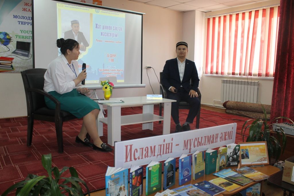 «Ислам діні – мұсылман әлемі» тақырыбында кітап көрмесі ұйымдастырылып, көрмеге Айғаным Бекжан библиографиялық шолу жасады. Тақырыпқа сай бейнеролик, слайд көрсетілді. Шараға С.Баишев жоғары медициналық колледжінің студенттері, №34 орта мектебінің оқушылары мен оқырмандар, кітапханашылар қатысты.