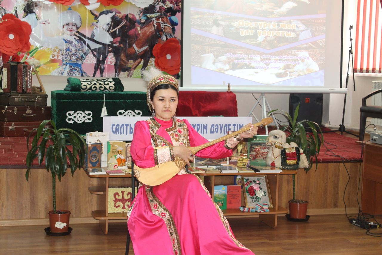 В ходе мероприятия была организована книжная выставка, Лаура Ериккызы провела библиографический обзор выстави. Был показан слайд на тему «Қазақтың дәстүрлері».