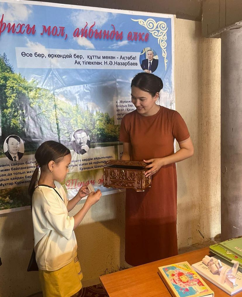 Ойын барысында балалар пазл құрастыру арқылы кітап кейіпкерлерін тауып, әдеби сандықшада жасырылған сауалдарға жауап берді. Сонымен қатар спорттық ойындар ойнап, кітапханаға саяхаттап, керемет көңіл-күймен тарқады.![]()
