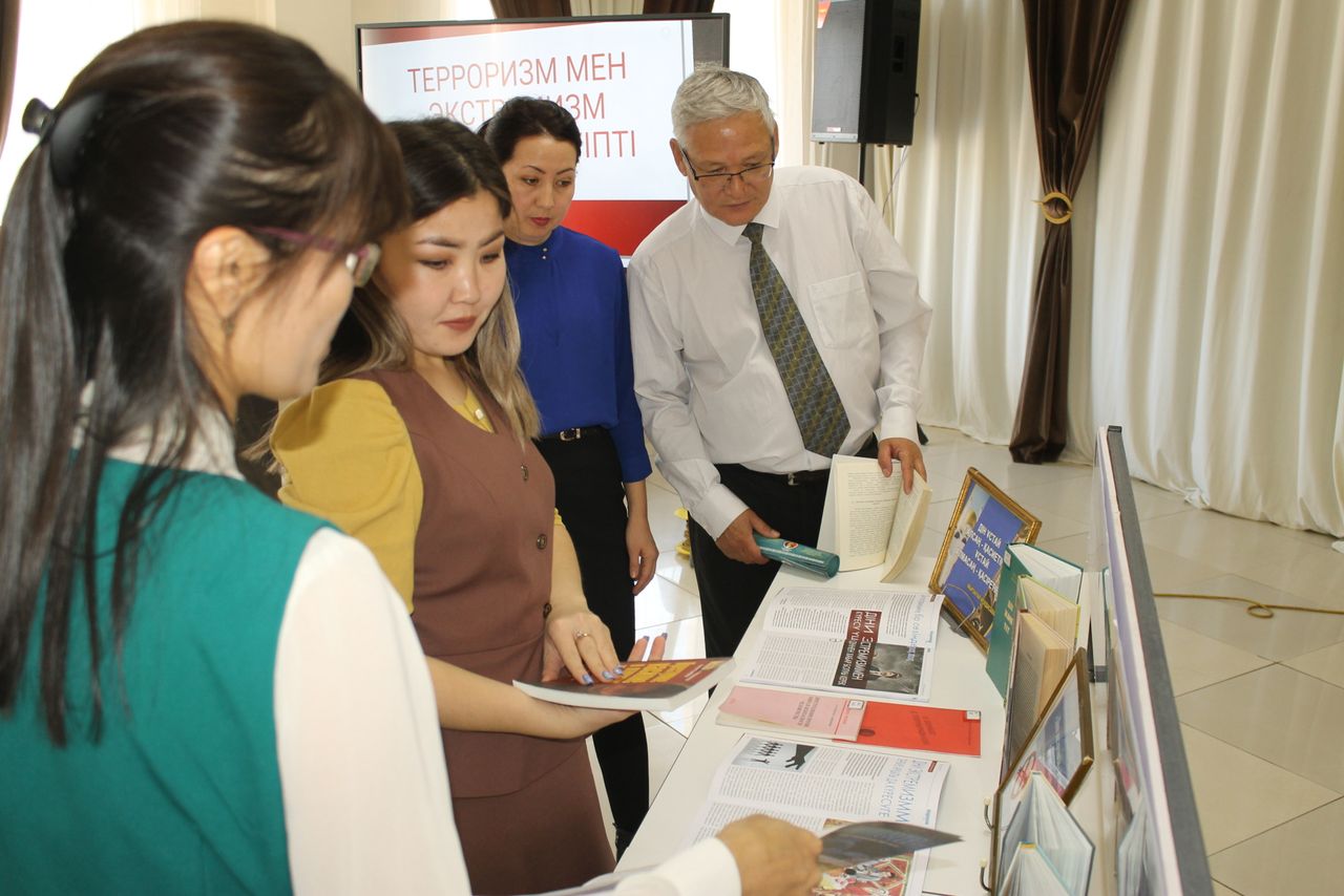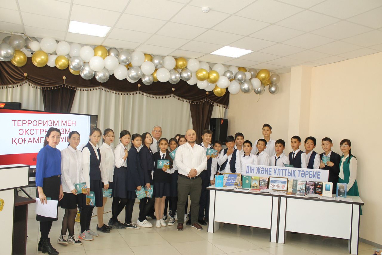 Была оформлена книжная выставка на тему «Дін және ұлттық тәрбие», проведен библиографический обзор выставки Айнур Нурсайыновны. Были продемонстрированы слайды и видеоролики по теме, розданы листовки и памятки.